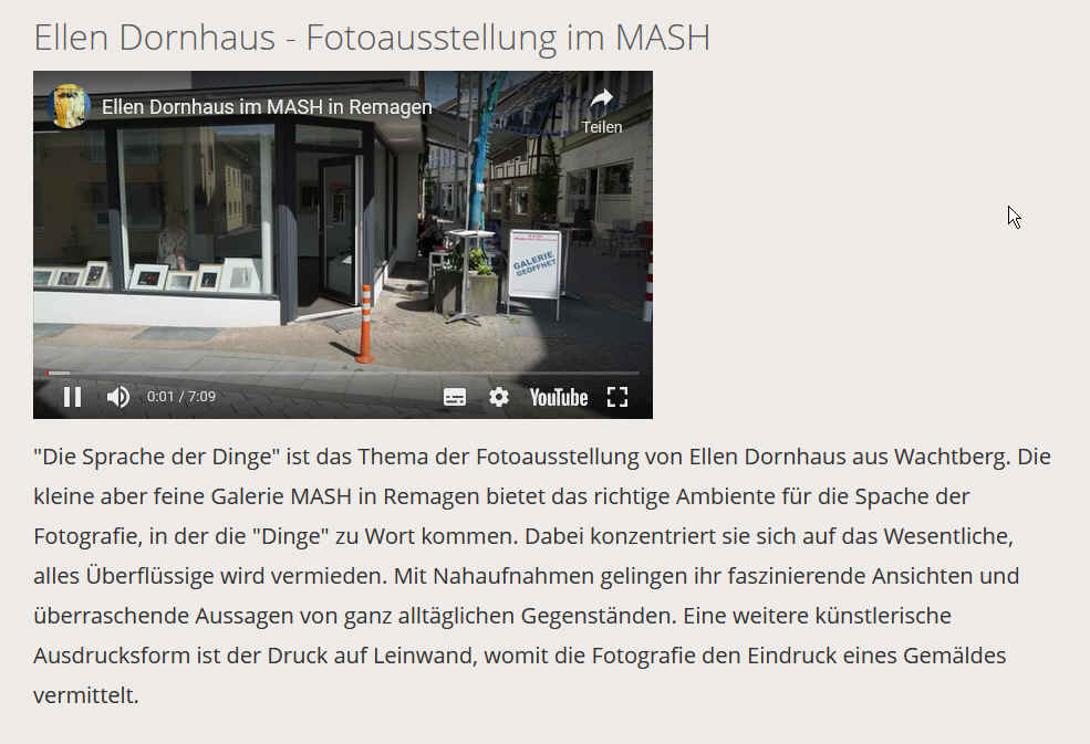 Gemeinschaftsausstellung Heimat Kunstverein Wesseling e.V., Kulturzentrum Schwingeler Hof, Schwingelerweg 44, 50389 Wesseling 10. - 31. Juli 2022 Aus der Einführung in die Ausstellung von Herrn Dr. Josef Gülpers: "Die Fotografie ist für Ellen Dornhaus zunächst Ausgangsmaterial, mit dem sie weiter arbeitet. Sie liebt den regennassen Wald, wenn die Tropfen von den Blättern rinnen ebenso wie den feinen Morgendunst. Diese Stimmung überträgt sie auf ihre Fotografien, sodass man oft nicht weiß, ob dies eine Fotografie oder eine feinstrichige Zeichnung ist. Licht und Farbe sind für sie wichtig. Farben bewegen uns, berühren uns, rufen Stimmungen in uns wach. Manchmal ändert die Künstlerin die Farbe und macht zum Beispiel aus einem Blaugrün ein Gelbgrün, um eine besondere Stimmung hervorzurufen. Man könnte sagen, Ellen Ruth Dornhaus malt mit der Kamera und oft dauert es eine Woche, bis sie mit der fotografischen Bearbeitung zufrieden ist. Die Künstlerin nennt auch ihre Werke nicht Fotografien, sondern Fotoarbeiten. Sie verstärkt den Kontrast, ändert die Farbe, doppelt Motive oder kombiniert zwei Bilder. "Ich bin nicht an die Realität gebunden", sagt sie. Gewöhnlichen Alltagsgegenständen verleiht Ellen Ruth Dornhaus eine besondere visuelle Kraft, Sinnlichkeit und Bedeutung. Diese Geduld, dieser Perfektionismus führt zu einer vollkommenen ästhetischen Komposition, die sich auf das Wesentliche konzentriert." Einführung zur Ausstellung von Dr. Josef Gülpers (Kunsthistoriker) Dr. Josef Gülpers: zu den Arbeiten von Ellen R. Dornhaus